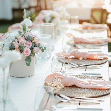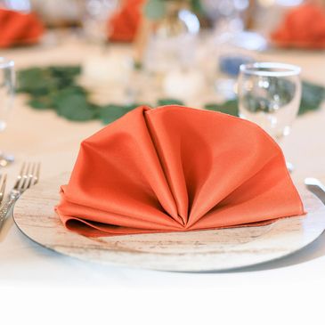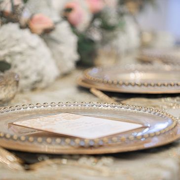 We offer a wide range of charger plates, dinnerware and glassware, napkins in various colors and styles perfect for any theme and color palette.